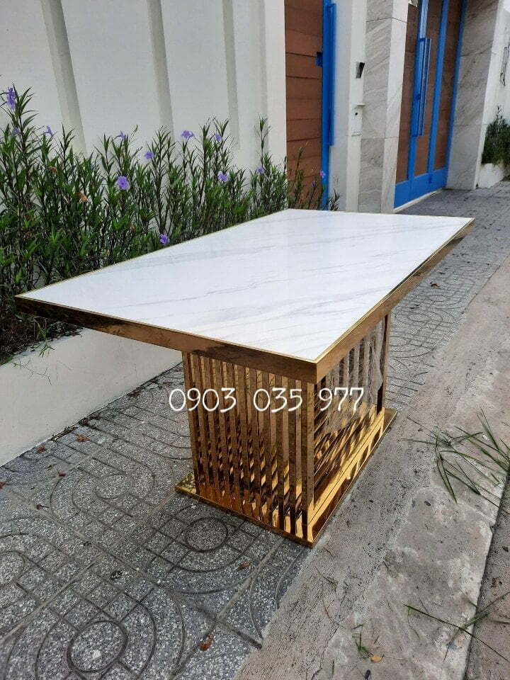 Bàn ăn chữ nhật khung mạ vàng