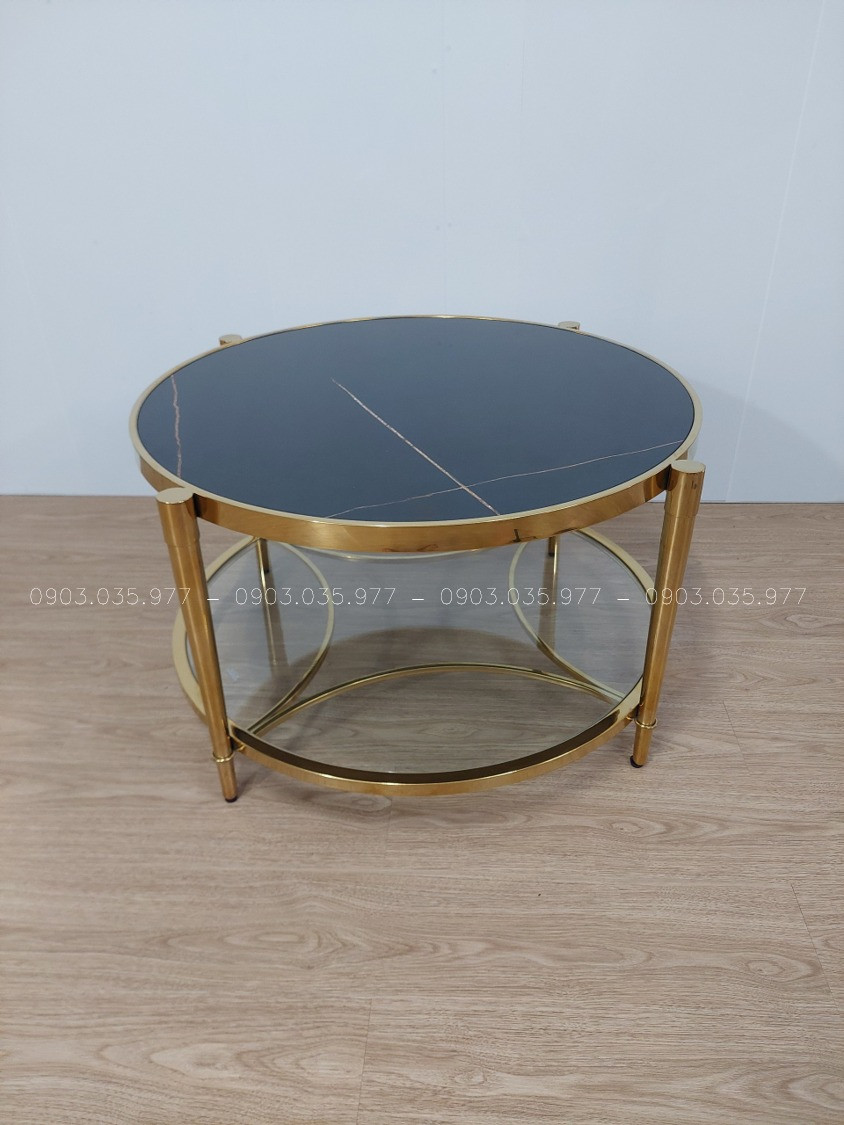 Bàn sofa inox mạ vàng mặt đá ceramic chống trầy, chống thấm cao cấp. Chất liệu đá ceramic chống ố, chống ố các vết bẩn như vết trà, nước ngọt không vệ sinh kịp thời.Bàn thiết kế 2 tầng tăng không gian sử dụng, thiết kế hiện đại thích hợp cho mọi không gian phòng khách. Chất liệu inox 304 cao cấp được mạ pvd chống gỉ sét, bền bỉ với thời gian. Mặt kính cường lực chắc chắn chịu lực va đập tốt.