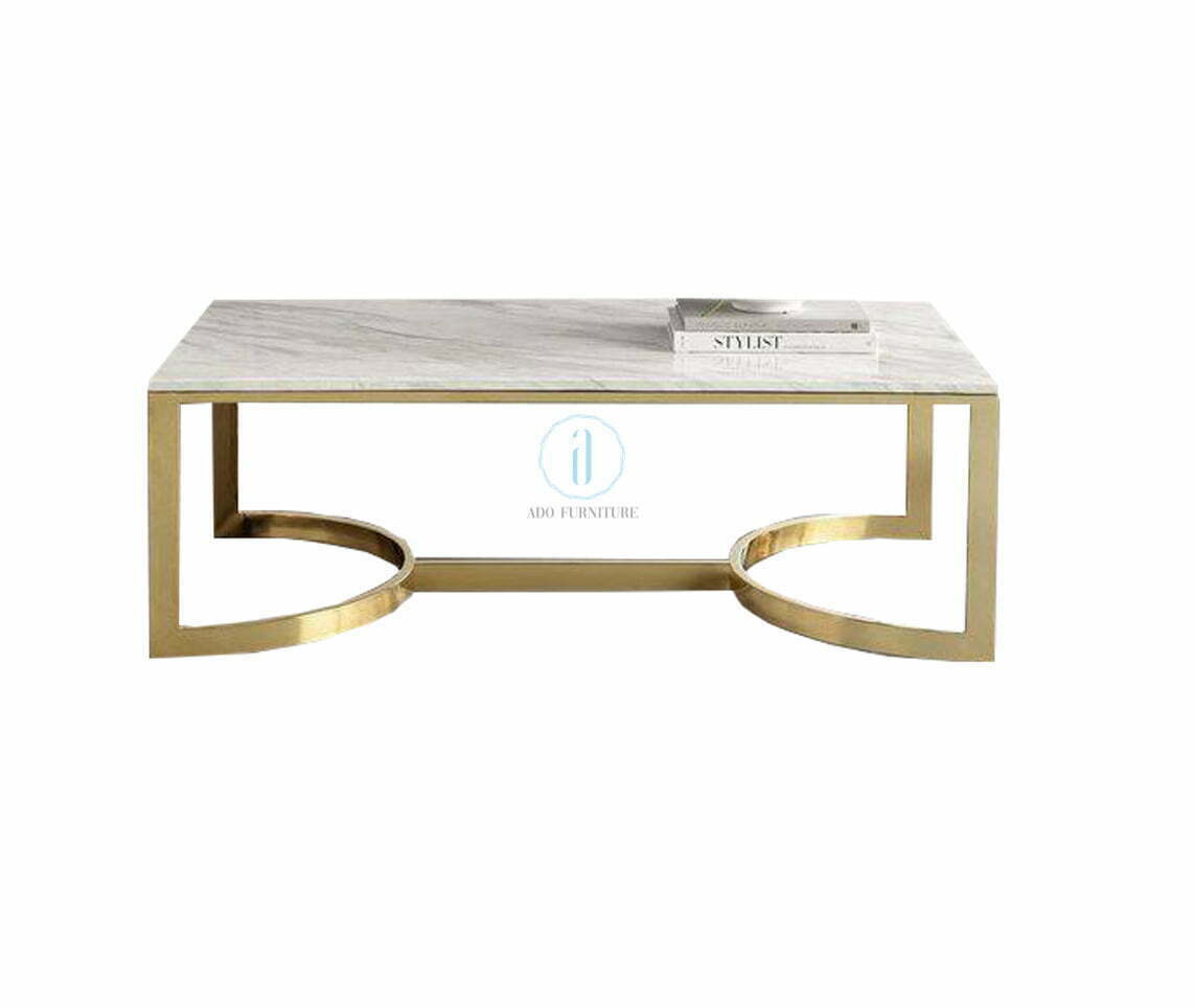 Bàn sofa mặt đá mạ vàng Ado 005 với chất liệu khung inox 304 mạ PVD màu, kết hợp mặt đá dày 14mm.