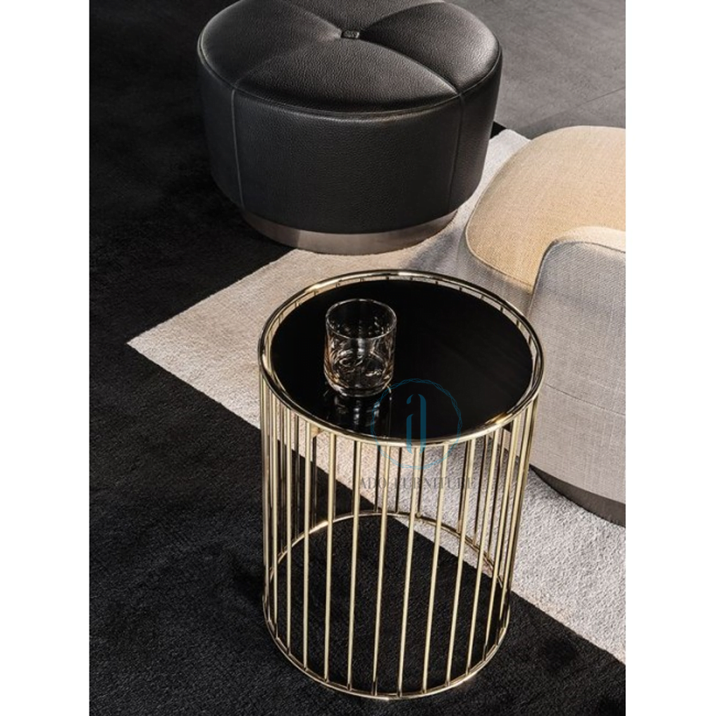 Bàn trà inox tròn mặt kiếng với chất liệu khung inox 304 xi Titan Gold, có mặt kiếng cường lực đen