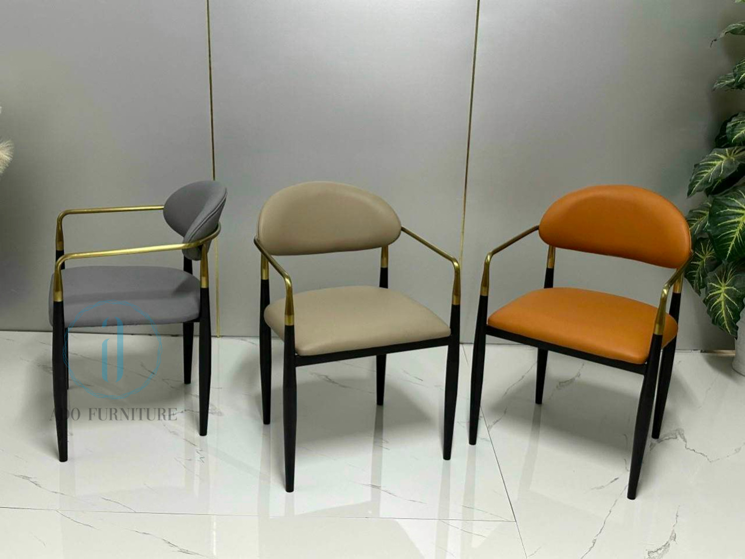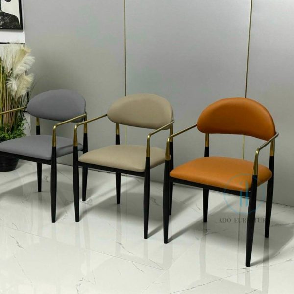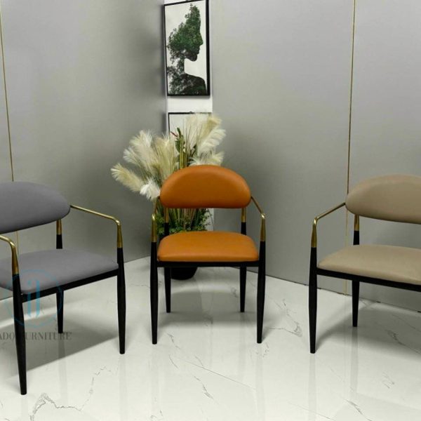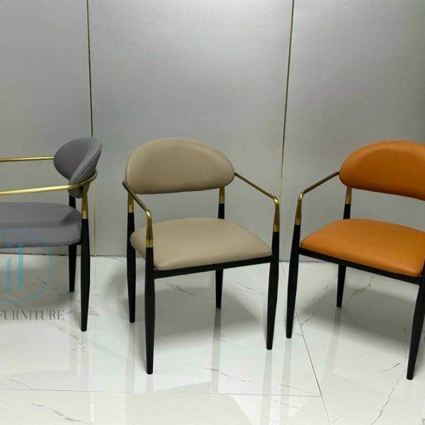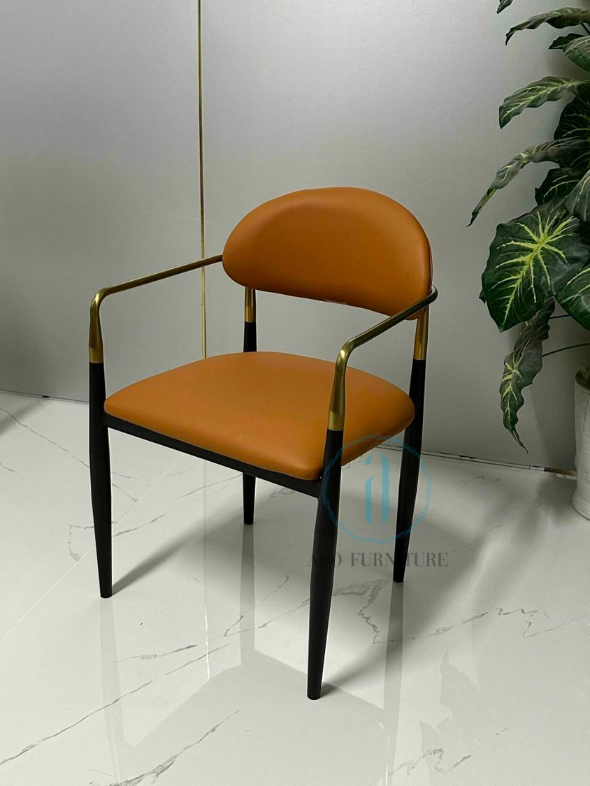 Ghế Jagger chất liệu : Khung sắt sơn tích điện , điểm nhấn màu vàng với chất liệu inox mạ PVD , cốt gỗ Polywood bọc nệm, da PU.