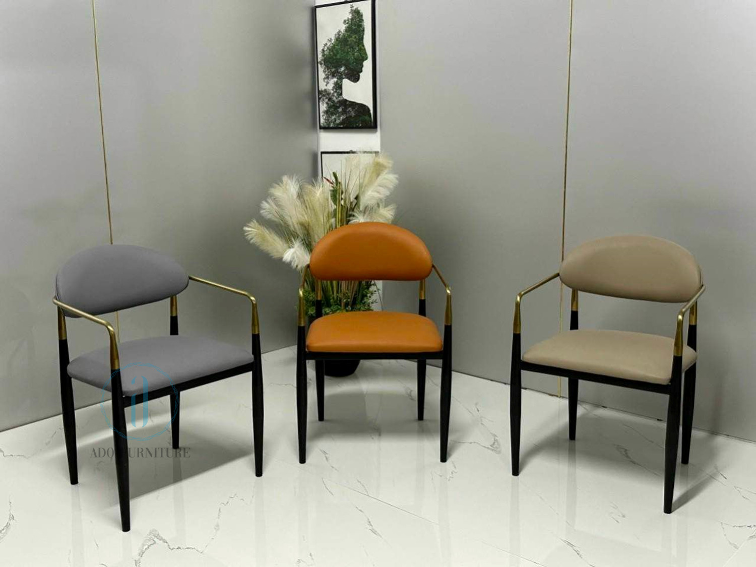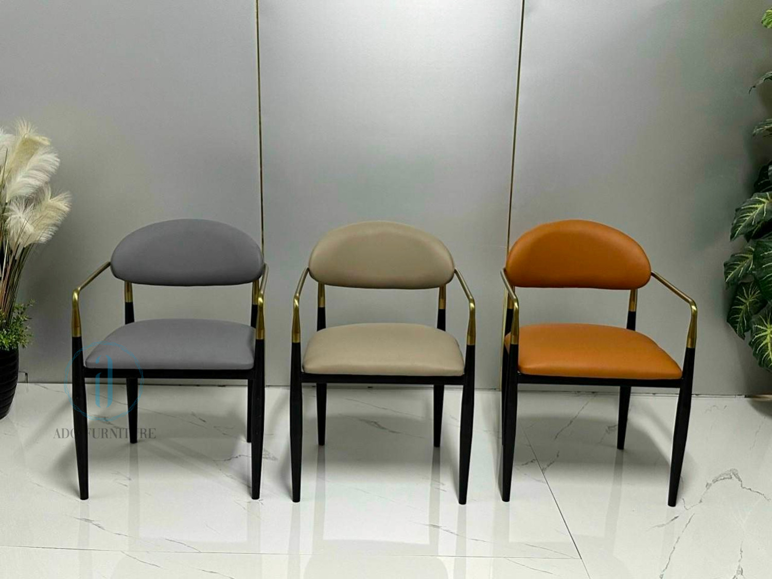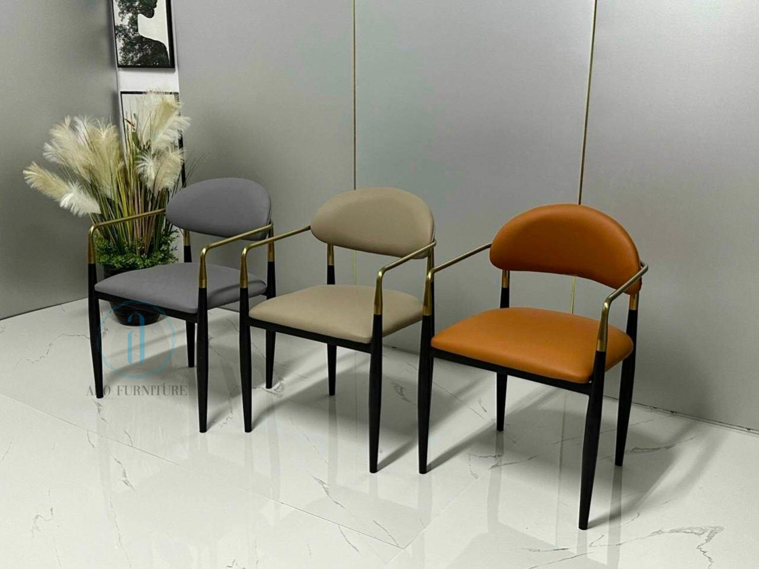 Ghế Jagger chất liệu : Khung sắt sơn tích điện , điểm nhấn màu vàng với chất liệu inox mạ PVD , cốt gỗ Polywood bọc nệm, da PU.