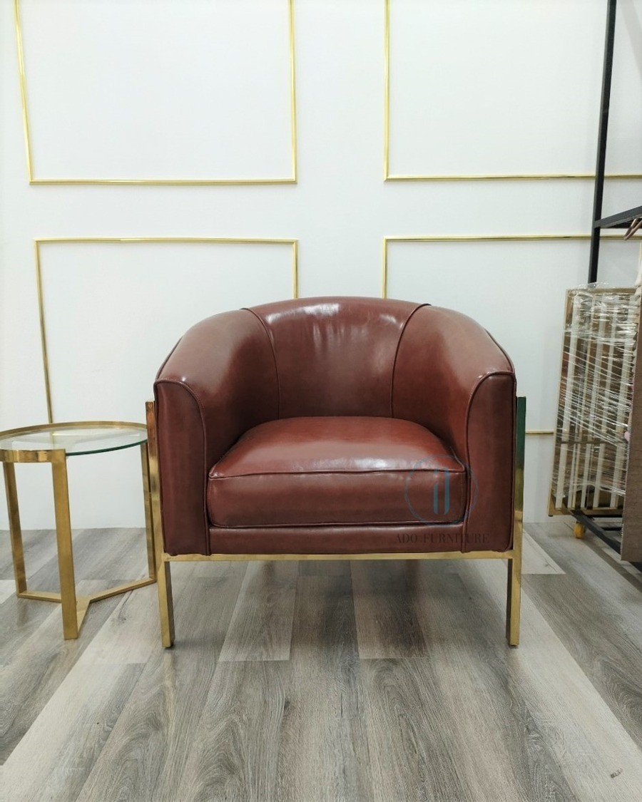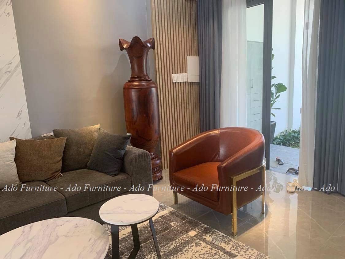 Ngoài điểm nhấn là phần chân inox 304 mạ pvd, chiếc ghế sofa đơn được bọc chất liệu da (Pu) bóng. Phần lưng ghế tựa chắc chắn êm ái, tay dựa rông rãi, ôm trọn lưng người ngồi mang lại cảm giác thư giãn sau những giờ làm việc căng thẳng. Ghế được sản xuất bởi đội ngũ thợ lành nghề, tỉ mỉ của xưởng nội thất Ado, chú trọng đến từng đường kim mũi chỉ. Phần khung ghế được bảo hành kết cấu 3 năm.