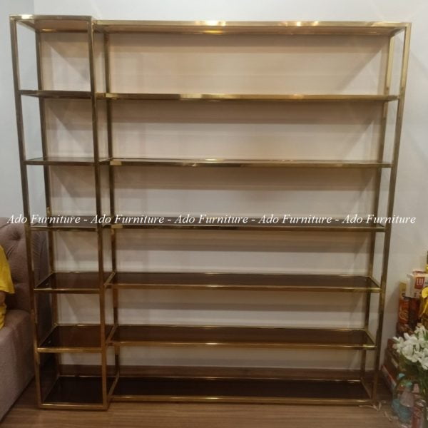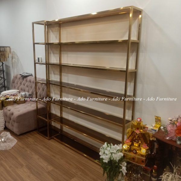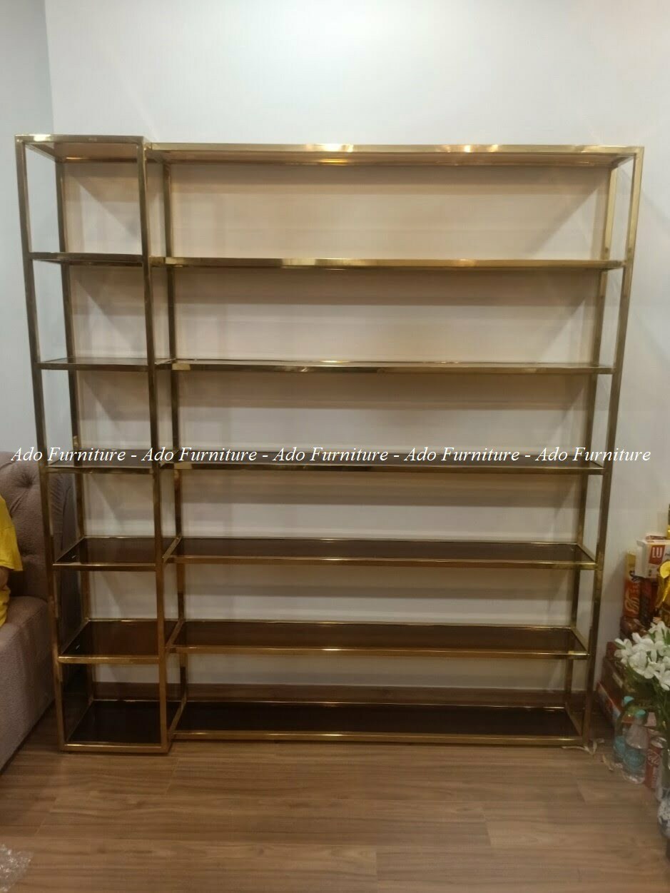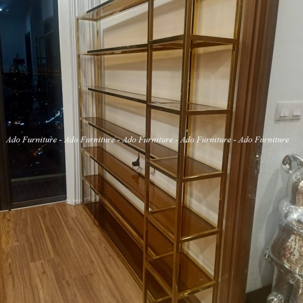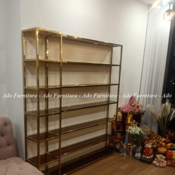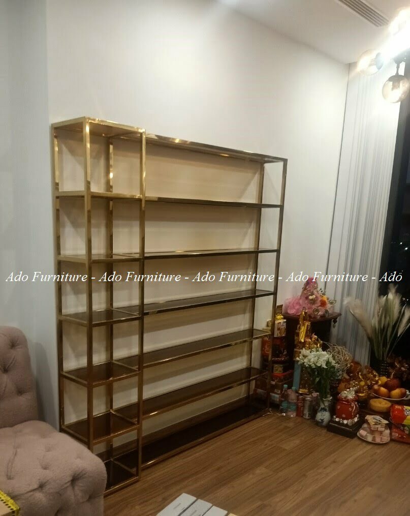 Kệ mỹ phẩm inox mạ vàng cao cấp có thể được dùng làm vách ngăn, hoặc vật dụng để trưng bày sách, rượu, vật kỷ niệm.