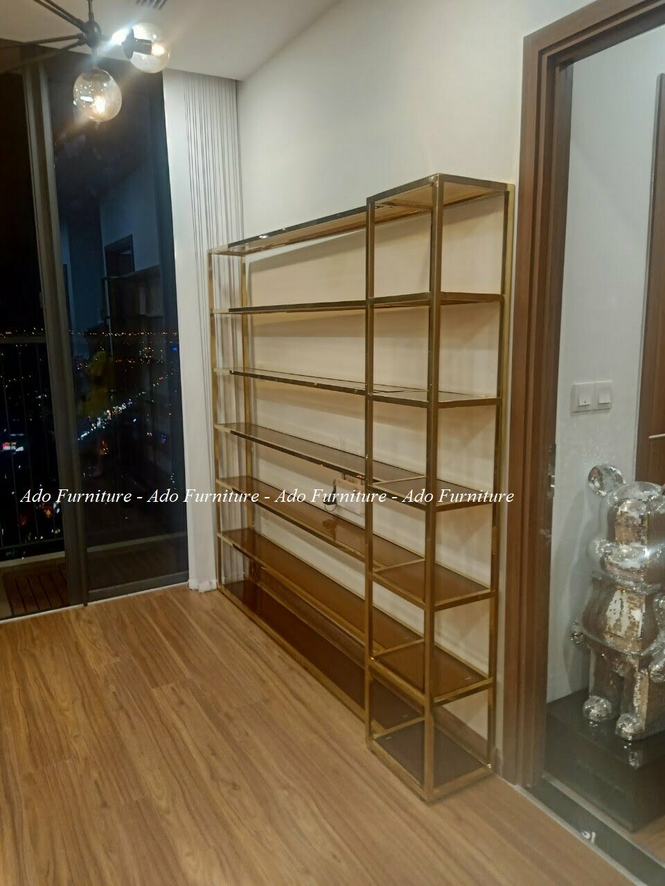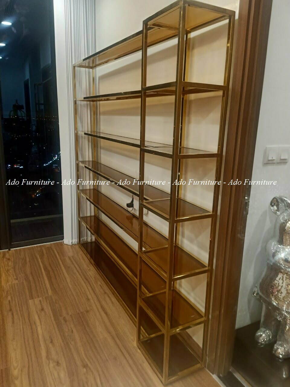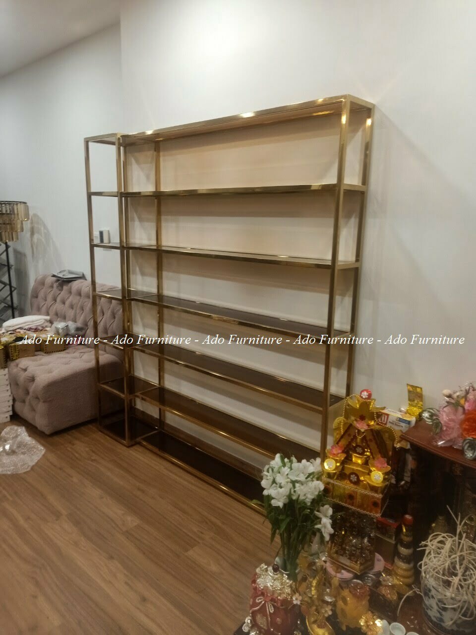 Kệ mỹ phẩm inox mạ vàng cao cấp có thể được dùng làm vách ngăn, hoặc vật dụng để trưng bày sách, rượu, vật kỷ niệm.